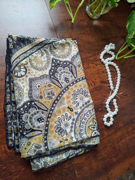 روسری زنانه،جنس حریر نخ طرحدار، دور دست دوز، روی سر لیز نمی خورد. روسری عرض ۱۱۰
