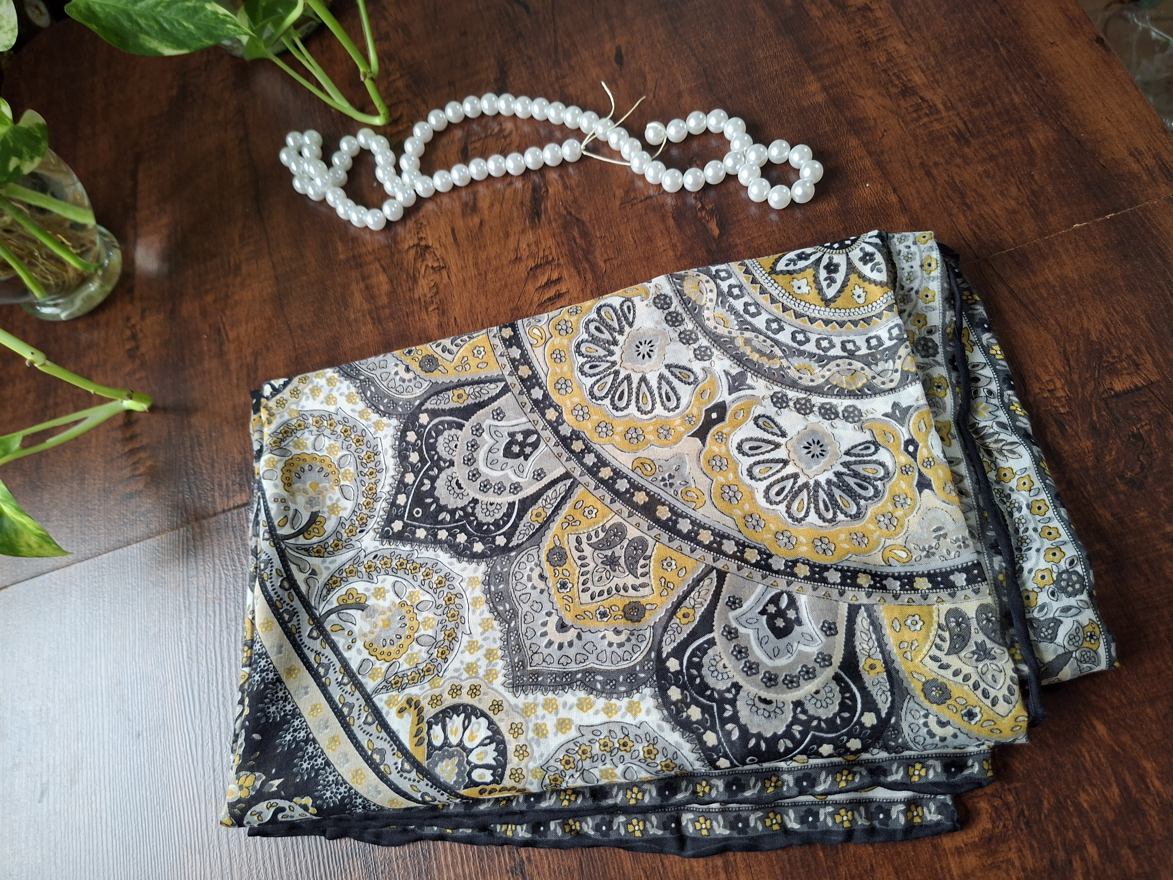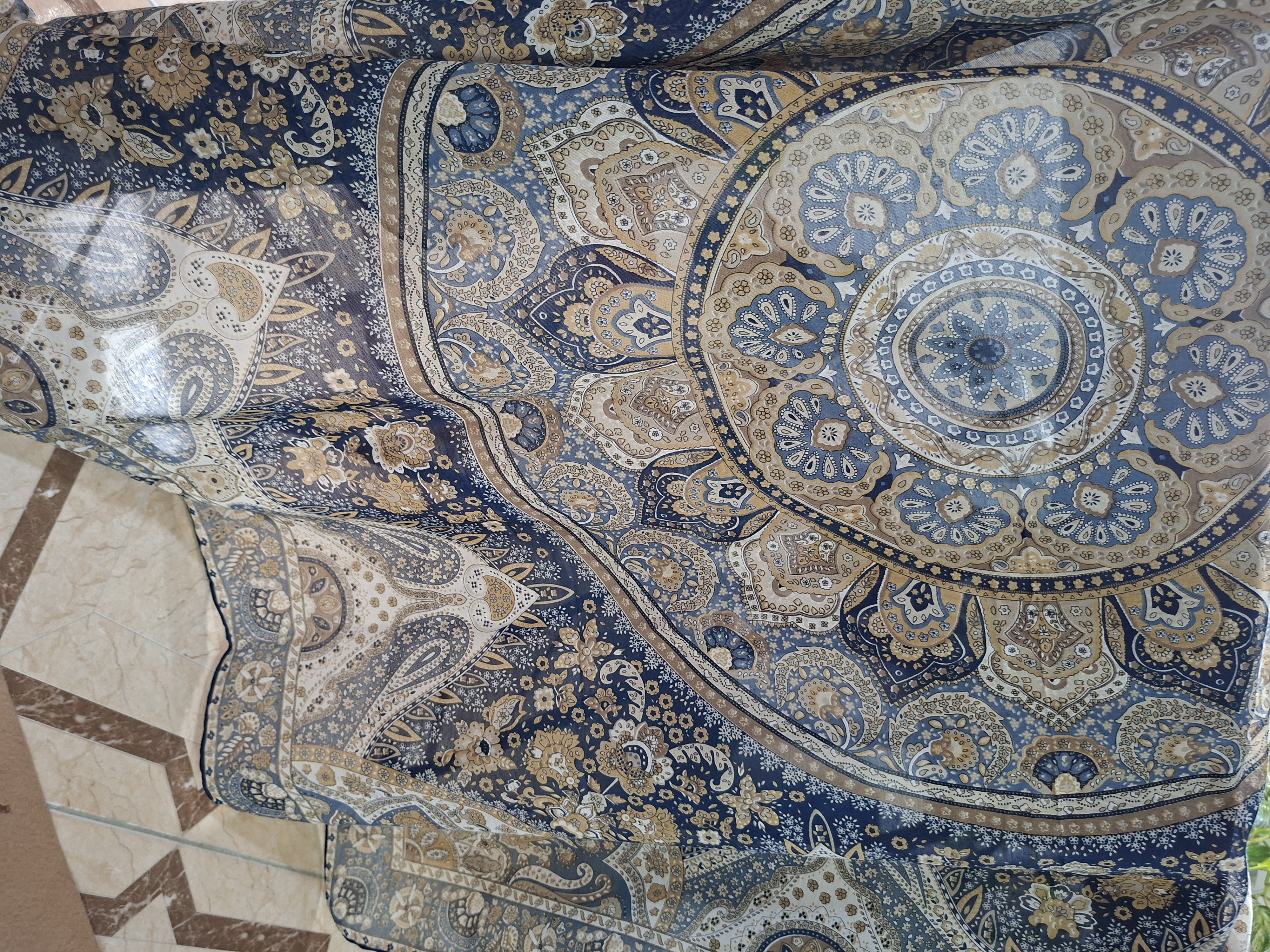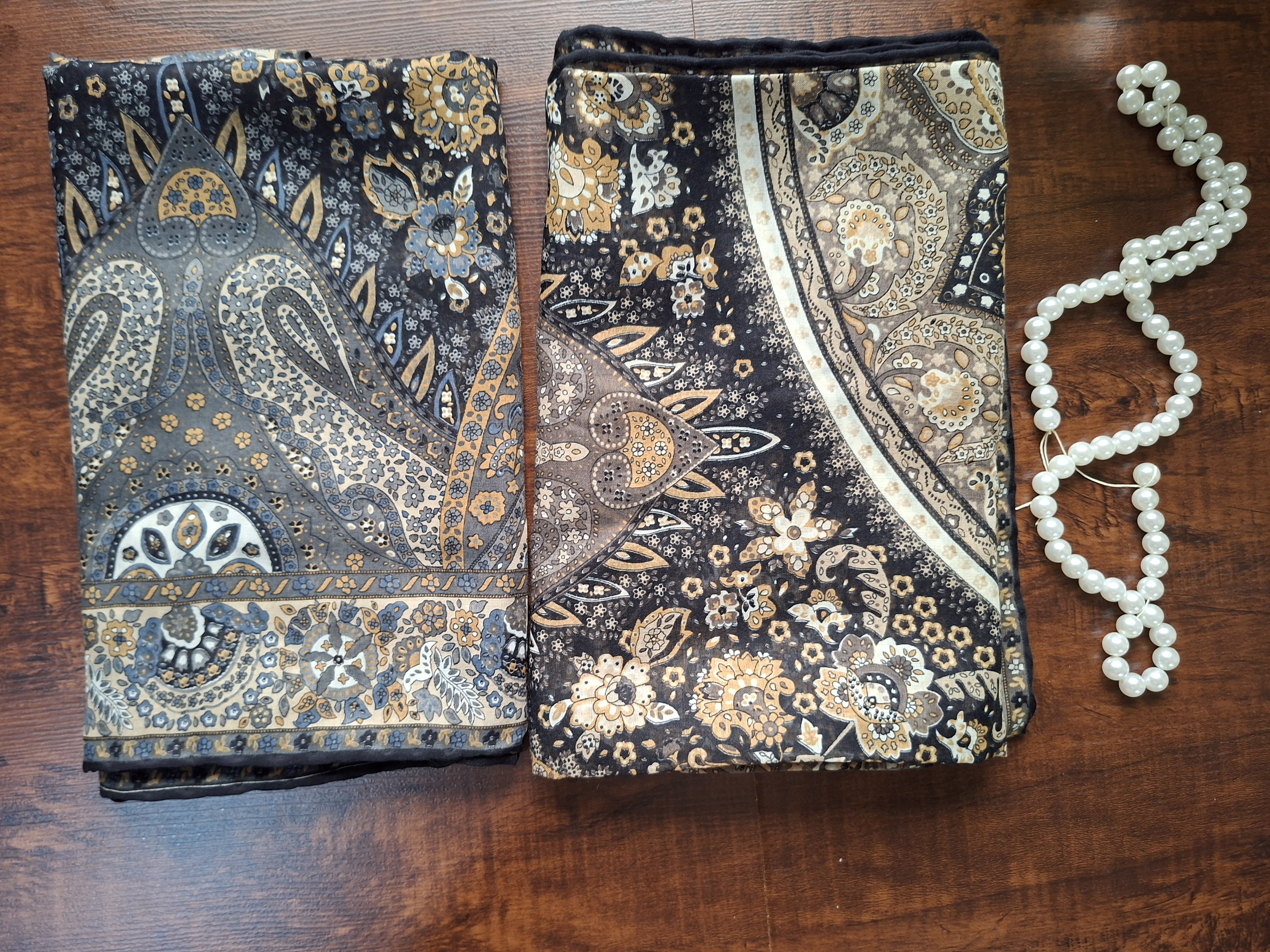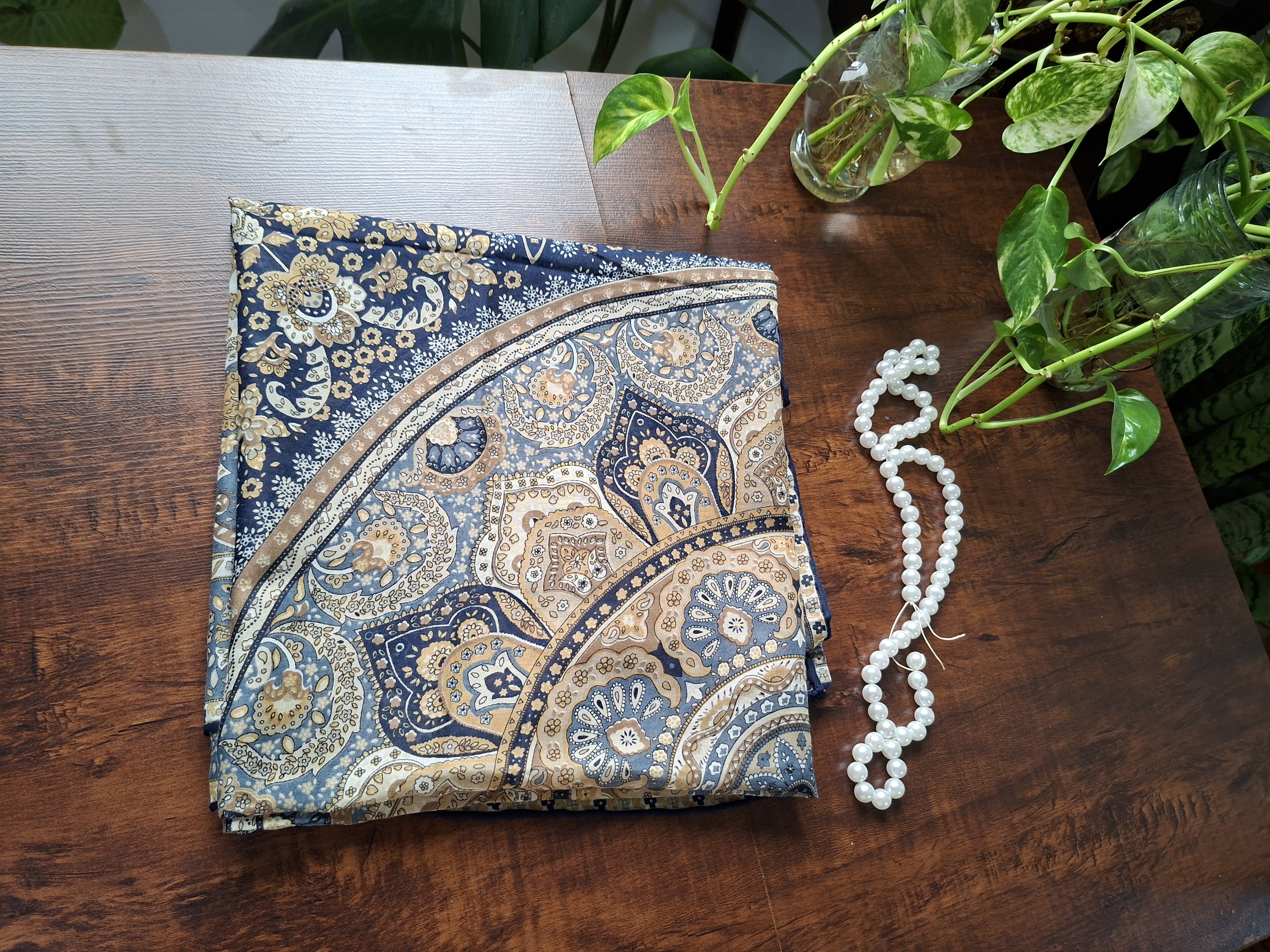 روسری زنانه،جنس حریر نخ طرحدار، دور دست دوز، روی سر لیز نمی خورد. روسری عرض ۱۱۰