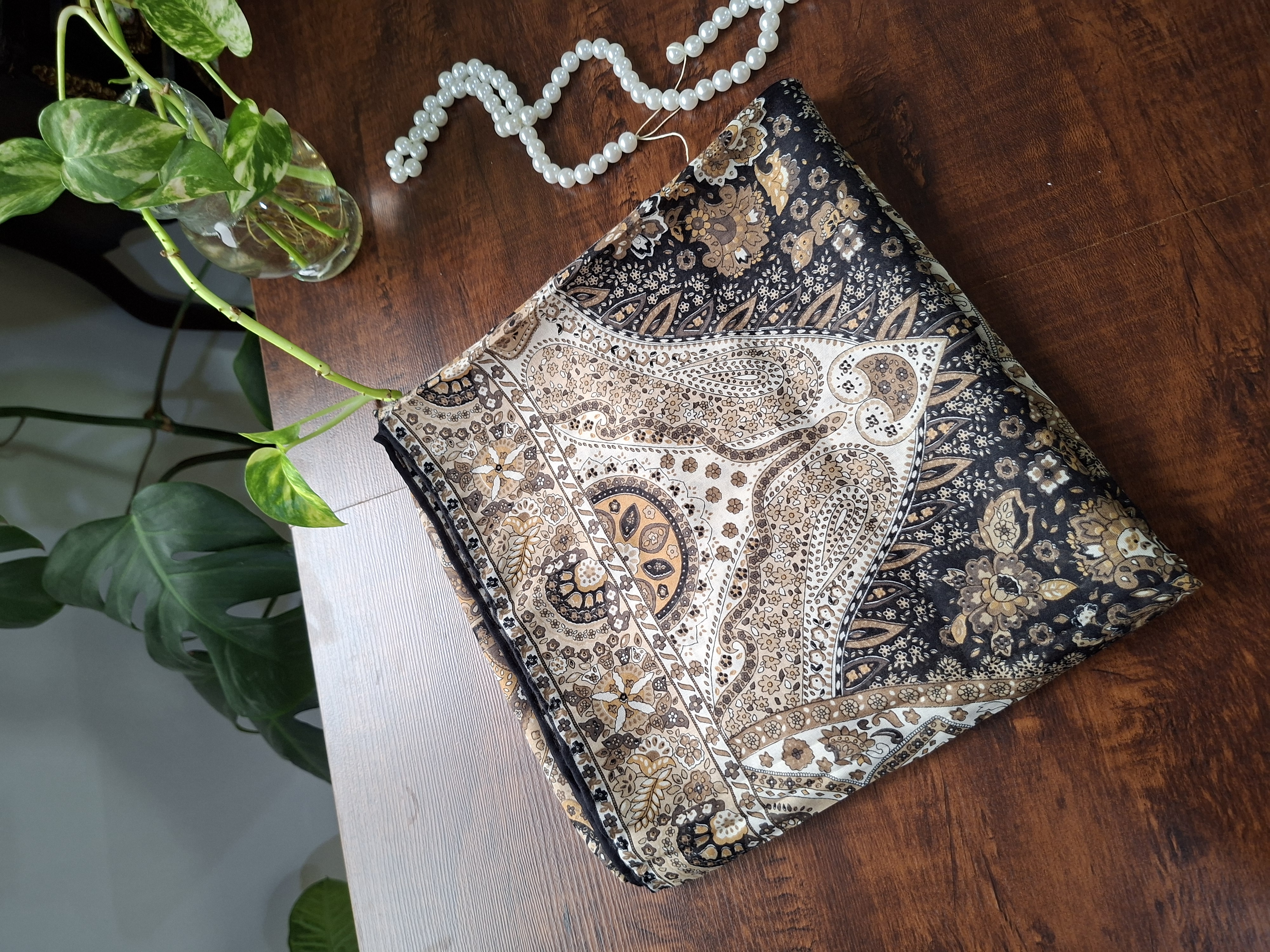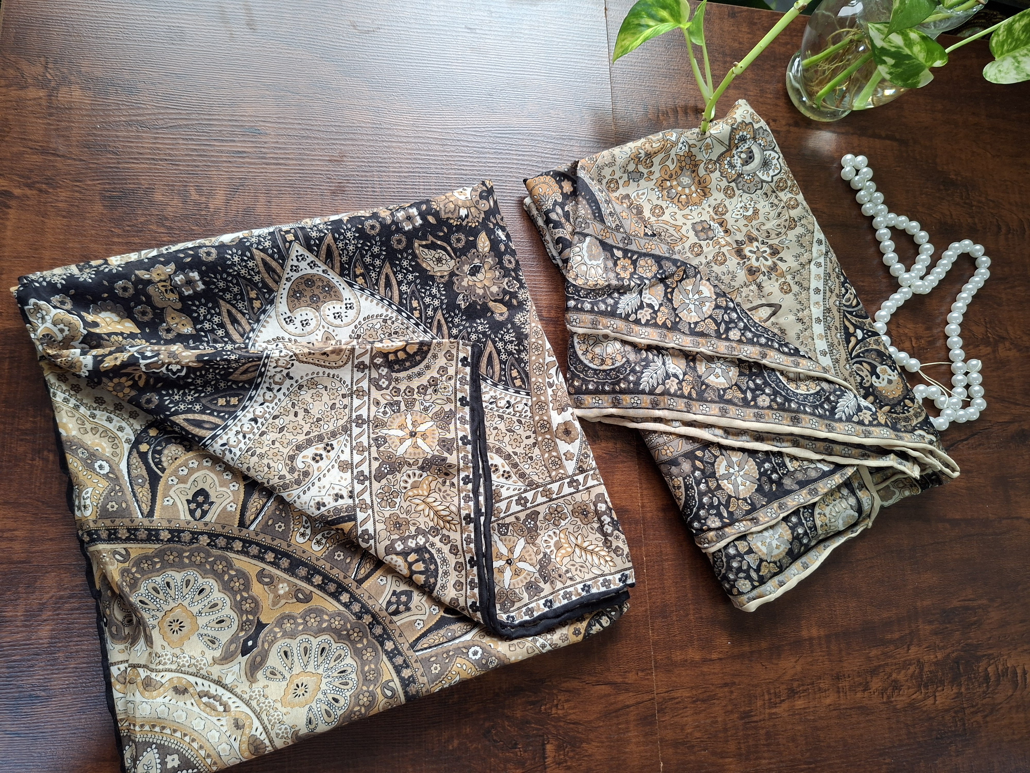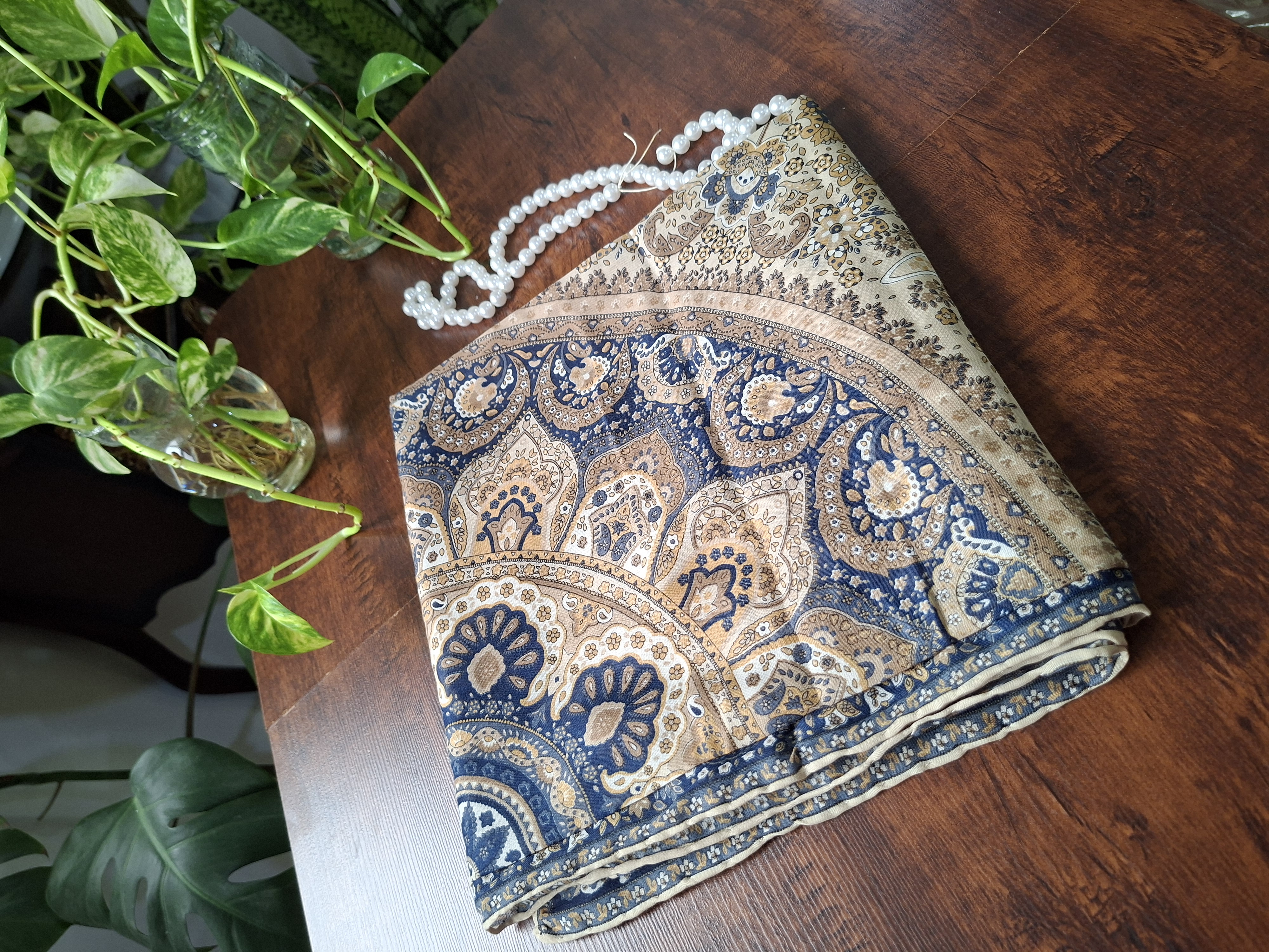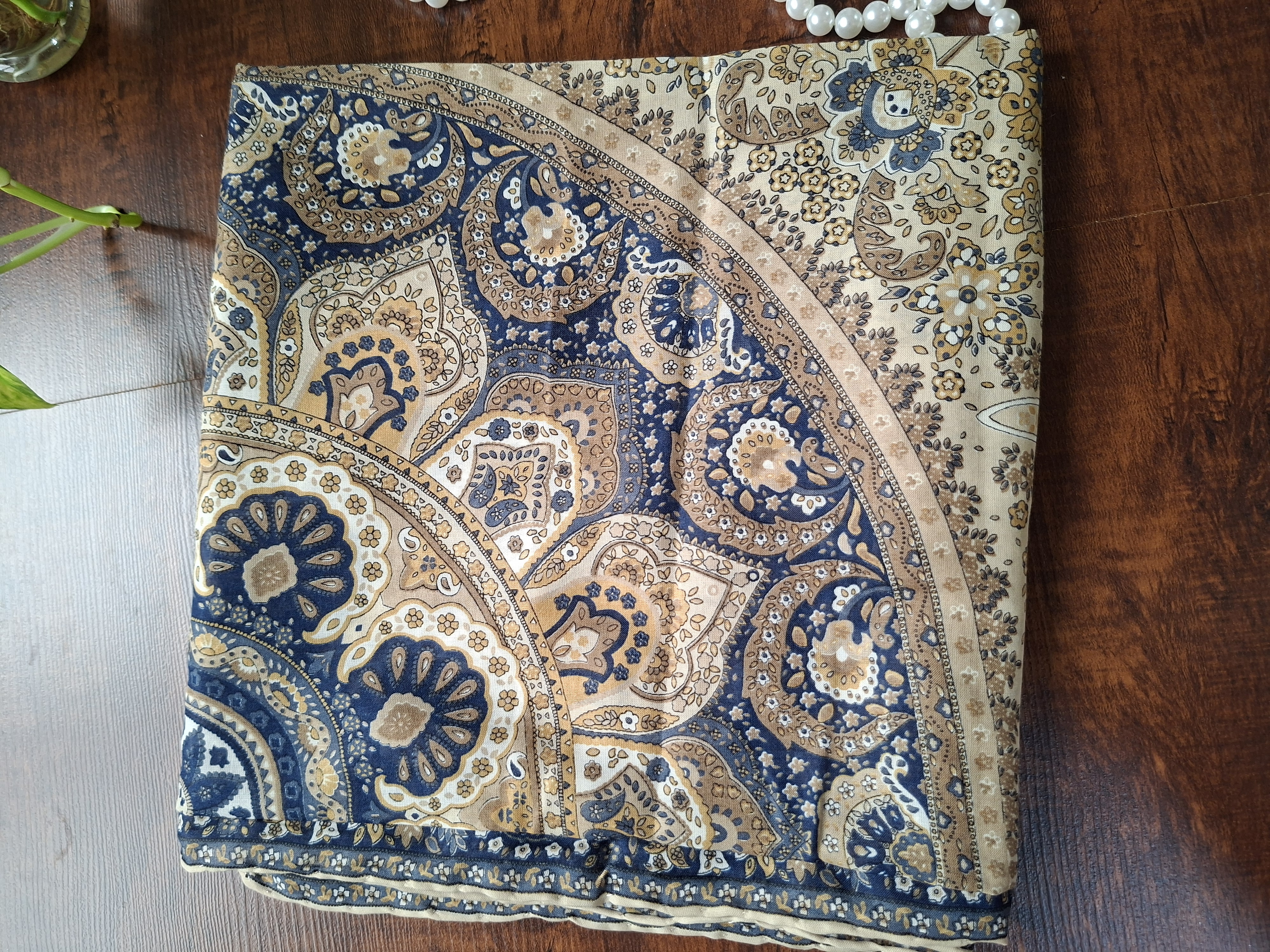 روسری زنانه،جنس حریر نخ طرحدار، دور دست دوز، روی سر لیز نمی خورد. روسری عرض ۱۱۰