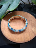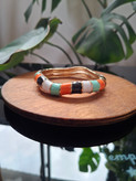 دستبند بنگل مینا کاری شده دفرمه کد ۵ سایز ۳ از جنس استیل و رنگ ثابت بوده و دارای ۲ رنگ بندی بندی ترکیبی ۱_ طلایی با تناژ رنگ آبی و ۲_ طلایی با تناژ رنگ ترکیبی نارنجی،آبی فیروزه ای ،مشکی و سفید میباشد. همچنین دور مچ تا ۲۲ سانت را پوشش میدهد.