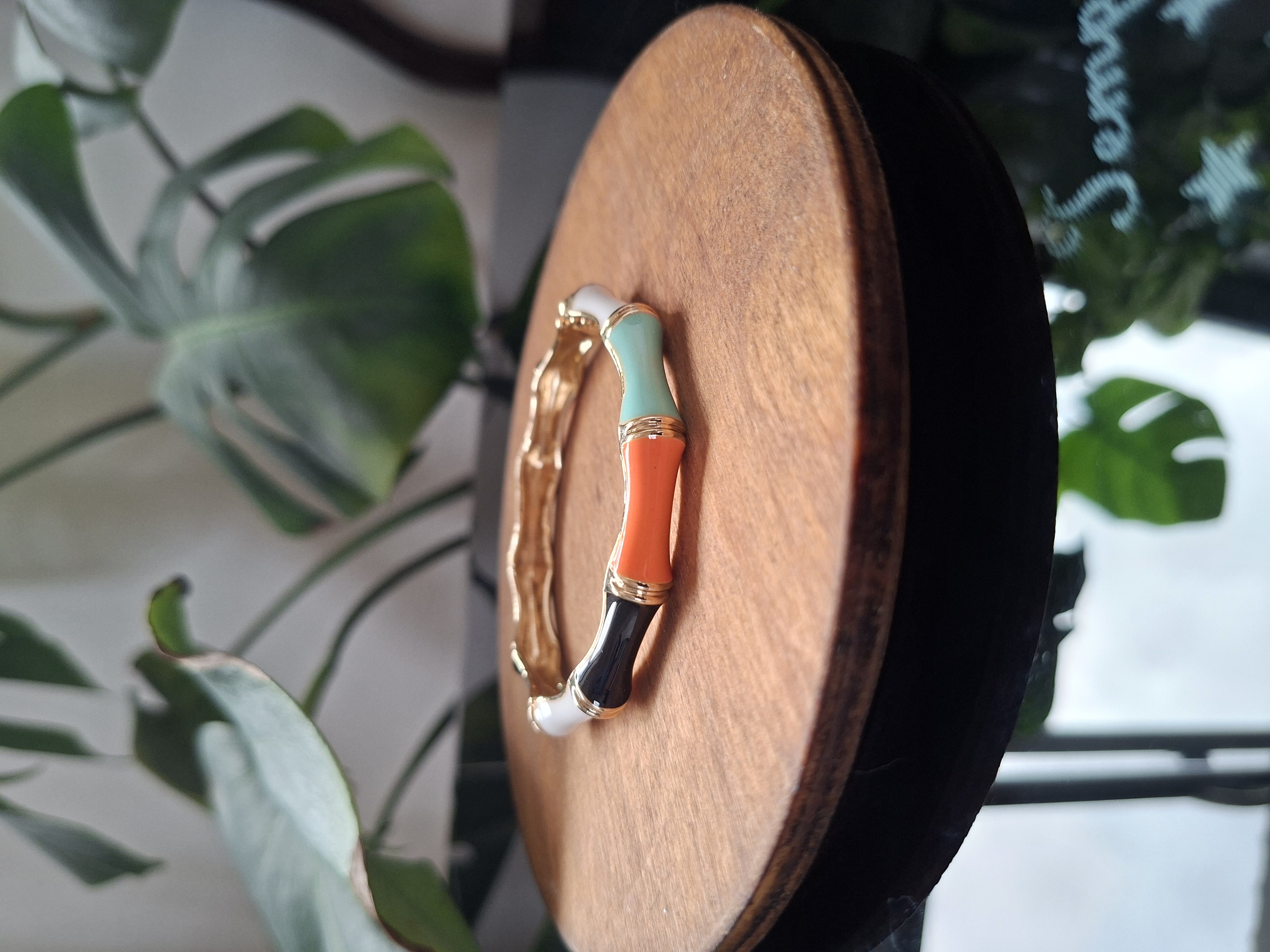 دستبند بنگل میناکاری شده کد ۷ سایز ۳ از جنس استیل و تماما رنگ ثابت بوده و تا دور مچ ۲۲ را پوشش میدهد قطر کار ۰.۷ میلیمتر بوده و دارای رنگ ترکیبی طلایی با تناژ رنگ سفید،مشکی،آبی فیروزه ای،نارنجی میباشد.